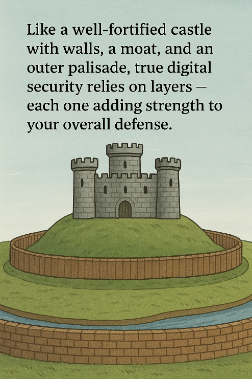 Think of your digital environment like a home: a lock on the front door helps, but a security system, outdoor lighting, and a safe make it much harder for intruders to succeed. Defense in depth applies this logic to your data.